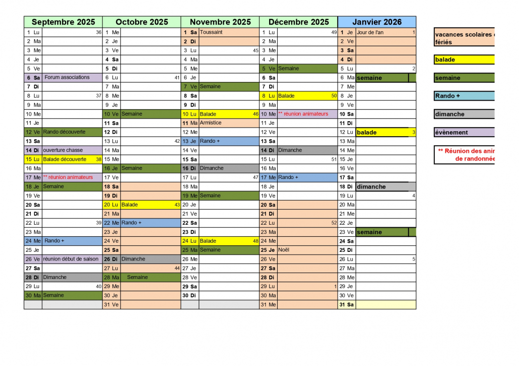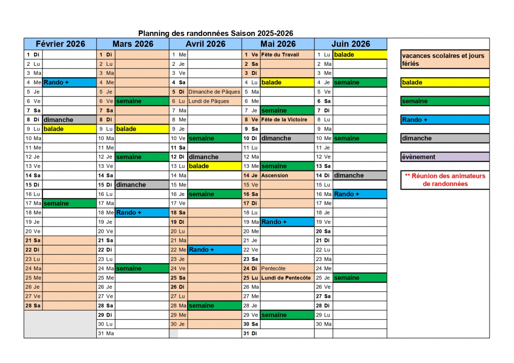 Ce programme présente une vue générale des randonnées organisées au cours de la saison. Il est susceptible d’être modifié. Consulter l’onglet « dernières nouvelles » pour avoir le programme du mois en cours.